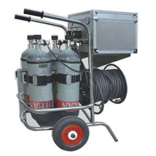 長管呼吸器由移動式供氣源和呼吸器組合而成,備有30m固定管1根、10m長管兩根,最大使用距離50m,配有2套呼吸罩,可供兩人同時使用。